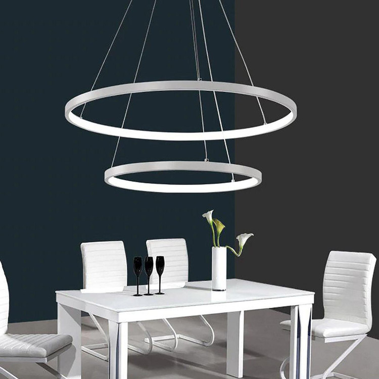 لوستر دو حلقه دایره به ابعاد 50_70 سانتیمتر، رنگ بدنه سفید استاتیک در سه نوع (آفتابی -مهتابی-چندرنگ) ارائه میشود.