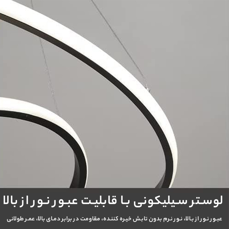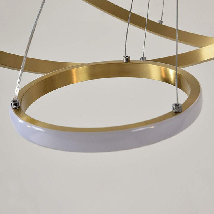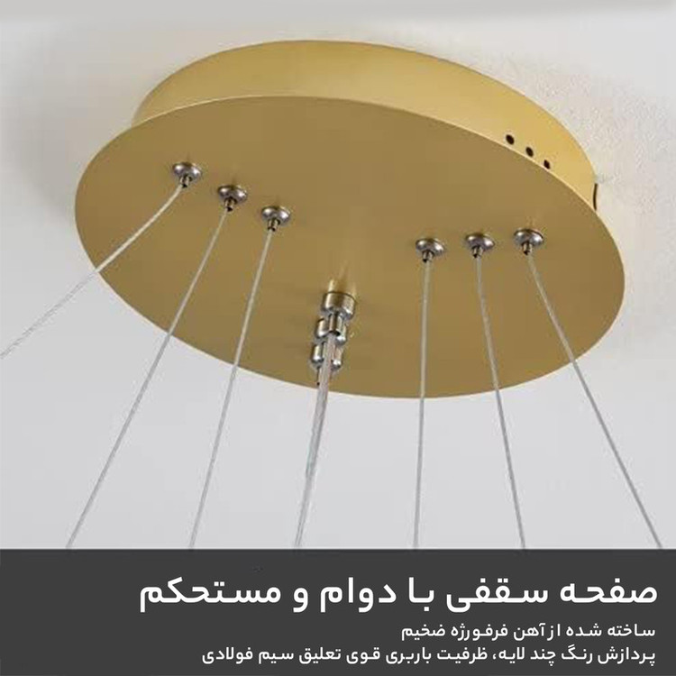 لوستر سه حلقه سقفی به ابعاد 70-50-30 سانتیمتر ،رنگ بدنه طلایی آبکاری ،در سه نوع (آفتابی ،مهتابی و چند رنگ) ارائه میشود ،از امکانات ریموت می توان کم و زیاد کردن نور ،حالت شب ، اپلیکیشن موبایل (کم و زیاد کردن نور ،تغییر طیف نوری ،تنظیم زمان برای خاموش یا روشن شدن ) ارائه میشود.