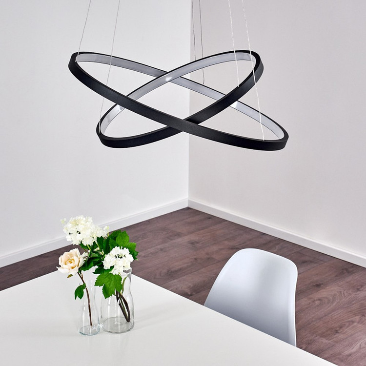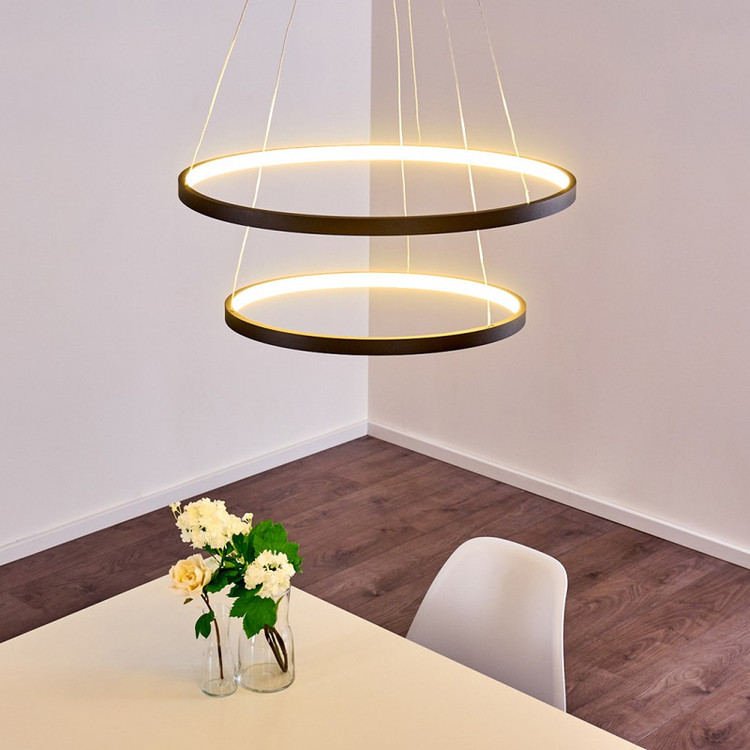 لوستر دو حلقه دایره به ابعاد 35-50 سانتیمتر ،رنگ بدنه مشکی استاتیک ،در سه نوع (آفتابی ،مهتابی و چند رنگ) ارائه میشود ،از امکانات ریموت می توان کم و زیاد کردن نور ،حالت شب ،اپلیکیشن موبایل(کم و زیاد کردن نور ،تغییر طیف نوری ،تنظیم زمان برای خاموش یا روشن شدن ) ارائه میشود