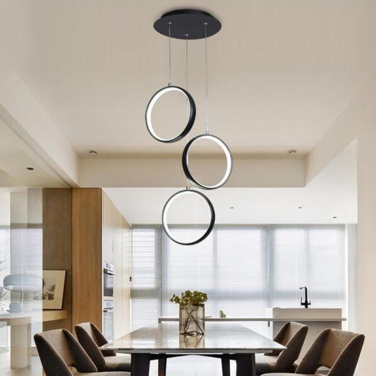آویز امیران لایتینگ، سه حلقه مشکی با قطر های 20 سانتیمتر و ارتفاع 1.20 سانتیمتر ،و ارتفاع قابل تنظیم می باشد .با کلید روی دیوار خاموش و روشن میشود.با نور آفتابی یا مهتابی قابل سفارش می باشد.